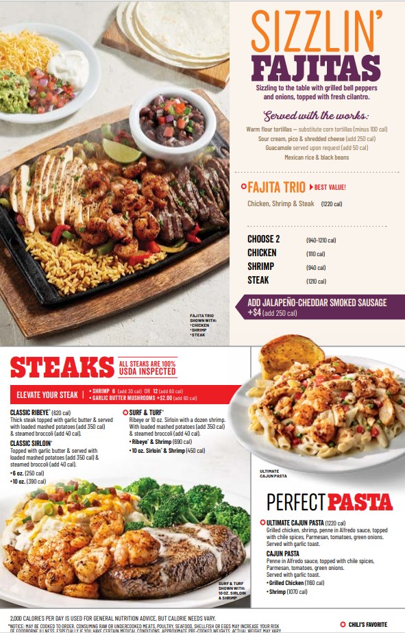 Chili's menu is a delightful tapestry of Tex-Mex classics and American favorites. Their standout Fajitas are a must-try, especially the Original Trio, which seamlessly combines steak, chicken, and shrimp. Served with freshly grilled bell peppers and onions, and a variety of sides including Mexican rice and freshly made guacamole, this dish invites you to customize your meal just the way you like it. Another highlight is the selection of Big Mouth Burgers®; the BBQ Brisket Burger and the Alex's Santa Fe Burger are incredibly satisfying, each layered with bold flavors like succulent brisket and creamy guacamole that burst in your mouth with every bite.